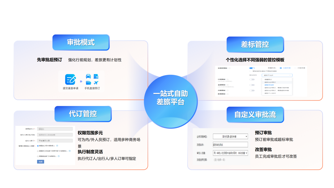 商旅服云平臺提供一站式的解決方案,幫助企業規范管理,提升大家的差旅出行體驗。將差旅制度配置到系統中就能實現差旅標準的差異化管理,實現事前、事中、事后全方位監管。