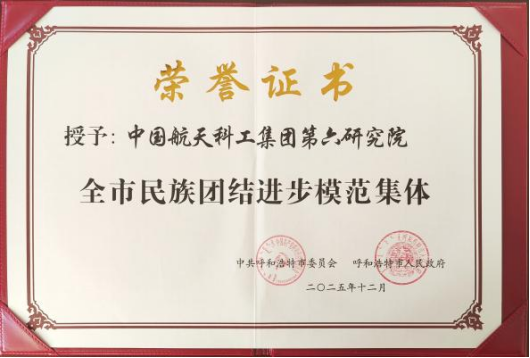 六院榮獲“呼和浩特市民族團結進步模范集體”榮譽稱號。多年來,六院始終牢記“科技強軍、航天報國”職責使命,將鑄牢中華民族共同體意識宣傳教育融入理論學習、科研生產、經營管理、社會責任履行等各個方面,探索具有航天特色、六院特點的民族團結進步創建之路,為呼和浩特市經濟社會發展、民族團結進步事業作出了積極貢獻。