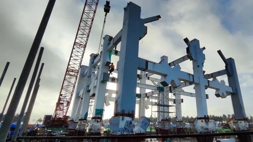 “一號發(fā)射工位預(yù)埋鋼柱腳的軸線定位精度要求為1mm,這樣的安裝精度要求遠(yuǎn)高于一般民用土建工程施工規(guī)范要求。”航天設(shè)計一號發(fā)射工位項目負(fù)責(zé)人汲生偉介紹。一號工位發(fā)射塔架是整個塔架的根基,其基礎(chǔ)施工要求一體化、一次性整體澆筑,土建安裝精度遠(yuǎn)小于規(guī)范要求的毫米級標(biāo)準(zhǔn)值。塔架建設(shè)還需要考慮防火、防腐、防銹的三防要求,在海邊高鹽霧環(huán)境下實現(xiàn)快速恢復(fù)、高質(zhì)量發(fā)射。