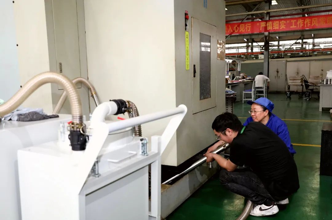 在大廳的另一側,車工小楊正認真地跟設備廠家人員學習清洗機床切削液。數控機床作為生產的關鍵設備,其運行狀態直接影響生產節奏。為確保其健康,該公司不惜投入重金,購置清洗機和凈化機,有效解決了設備維護保養耗時耗力、清理不徹底的難題。