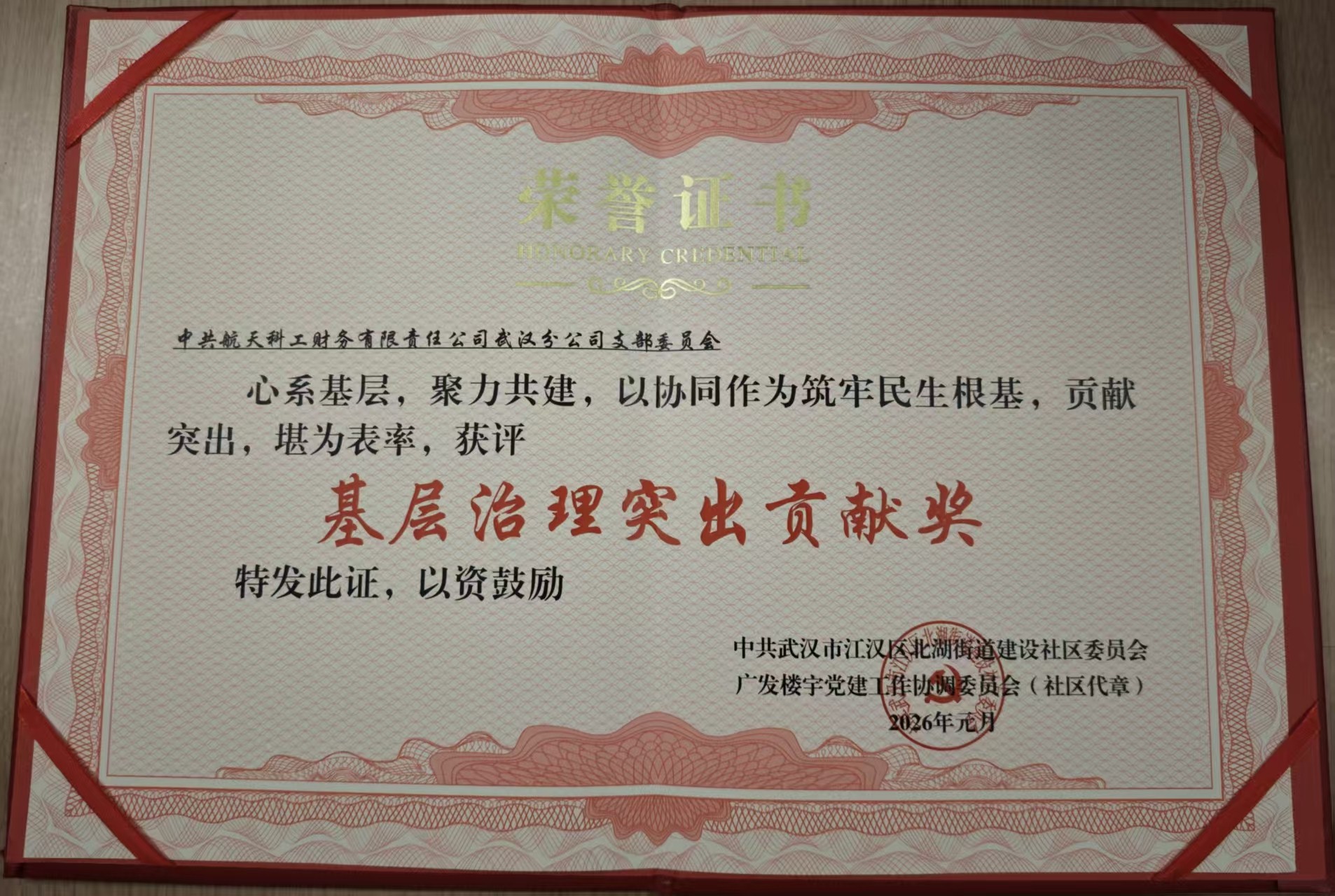 近日,財務公司武漢分公司黨支部獲評所在街道社區黨委和樓宇黨建工作協調委員會頒發的“基層治理突出貢獻獎”,表彰武漢分公司黨支部在街道基層治理中展現的責任擔當和積極作為。
