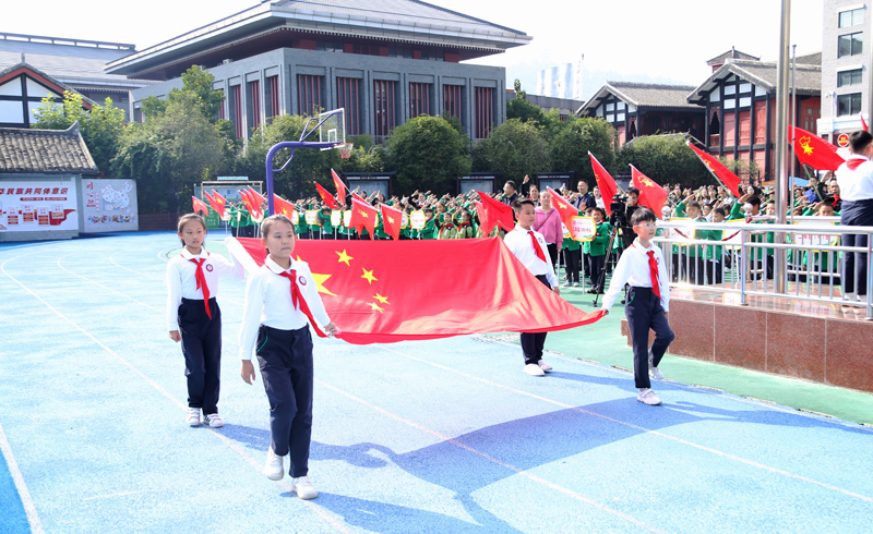 升旗儀式開始前,五星紅旗依次在十院青年代表、文化小學少先隊員代表手中傳遞,并由少先隊員代表將國旗傳遞至儀仗隊。伴隨著雄壯激昂的國歌,鮮艷的五星紅旗冉冉升起。