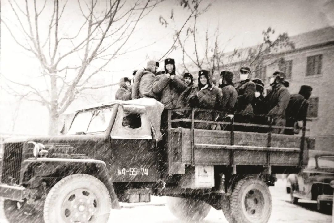 1959年張履謙前排(左一)等人在風雪時節奔赴紅旗一號導彈雷達試驗場的途中