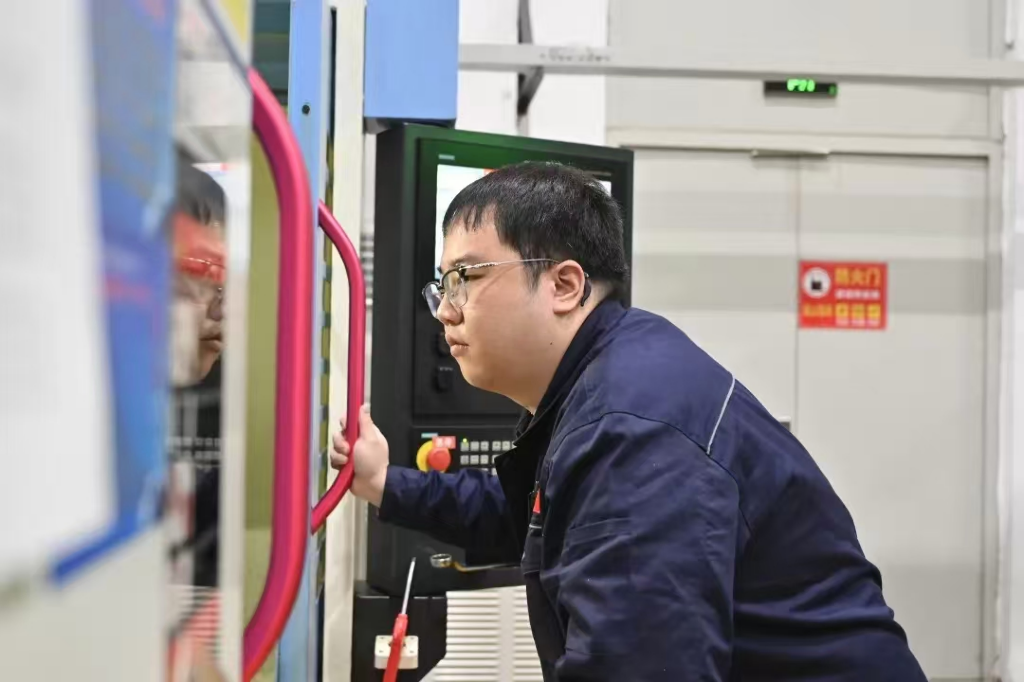 車間里,機床準時轟鳴,他換上工裝,俯身、調試、啟動……