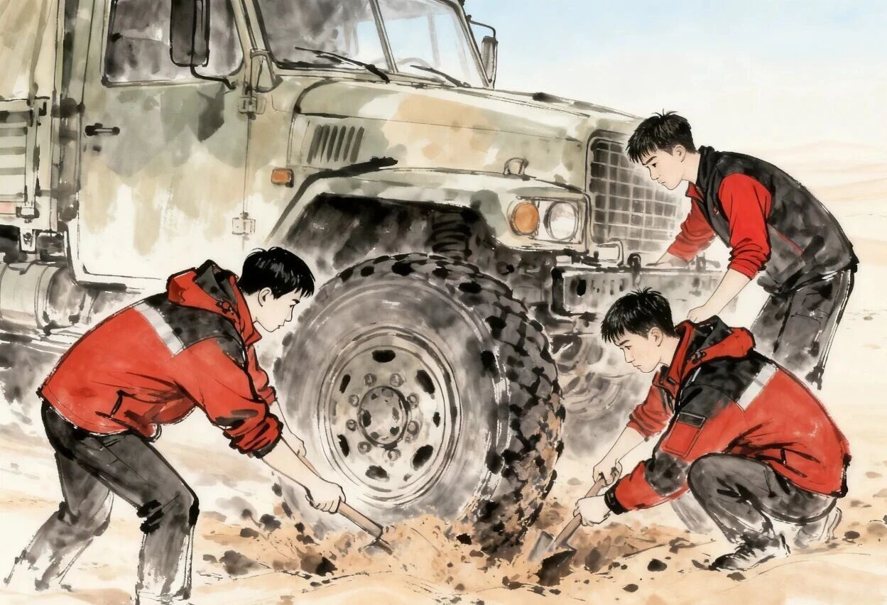 大家輪班接力,經過數小時的奮戰,深陷的車輪終于露出足夠的受力空間,緩緩駛出沙坑,奔赴目的地。
